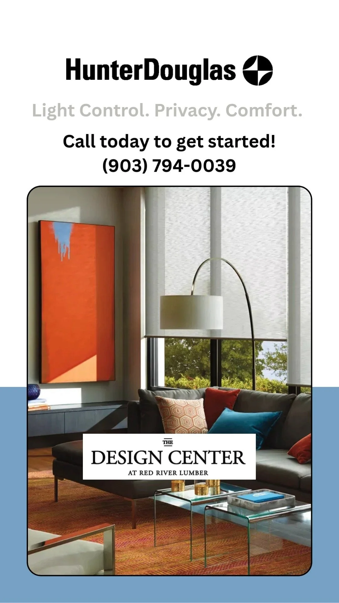 Now offering Hunter Douglas window treatments, including custom blinds, shades, and drapery for homes in Texarkana and surrounding areas.